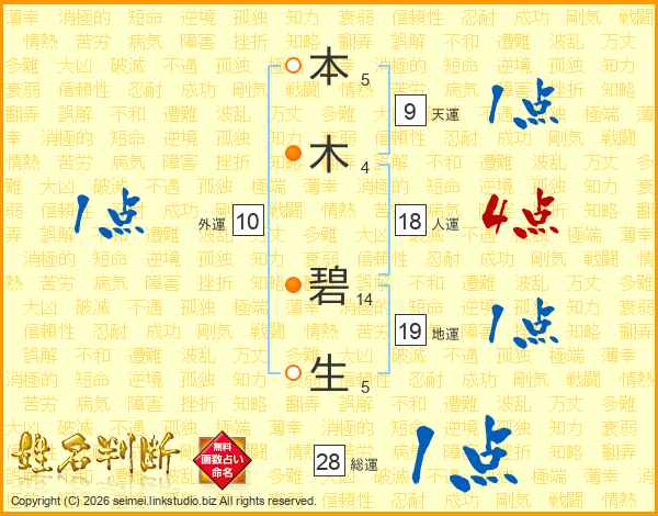 本(5画)木(4画) 碧(14画)生(5画)