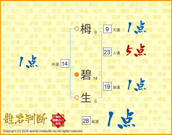 生活面を象徴する運勢です。外部から受ける影響力を表し、結婚運、家庭運や職場、環境への順応性を表します。総運から人運を引いた画数。姓や名が1文字の場合を除く。