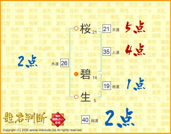桜(21画) 碧(14画)生(5画)