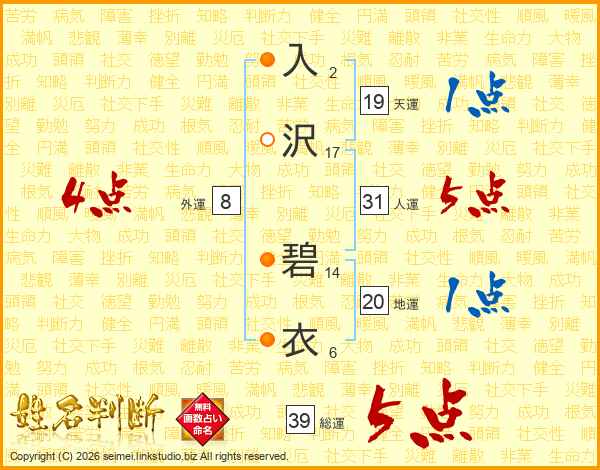 入沢碧衣さんの総運は39画の5点!