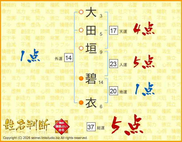 大(3画)田(5画)垣(9画) 碧(14画)衣(6画)