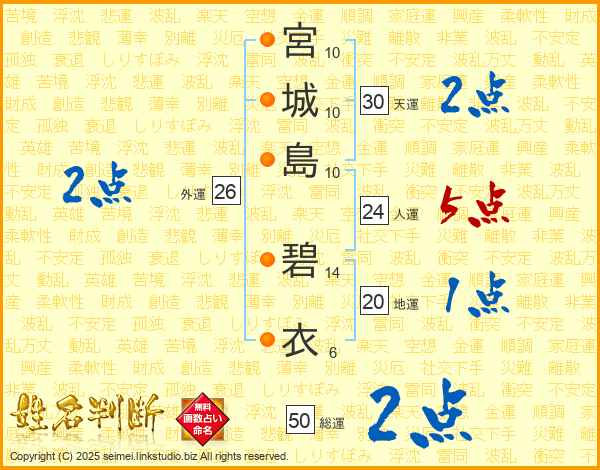宮(10画)城(10画)島(10画) 碧(14画)衣(6画)