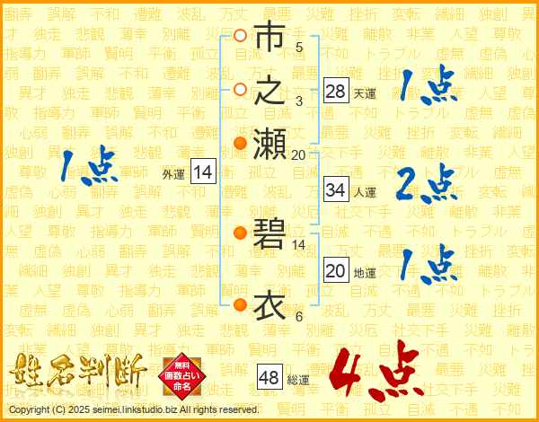 市(5画)之(3画)瀬(20画) 碧(14画)衣(6画)