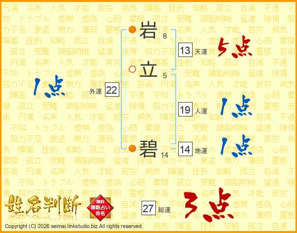 生活面を象徴する運勢です。外部から受ける影響力を表し、結婚運、家庭運や職場、環境への順応性を表します。総運から人運を引いた画数。姓や名が1文字の場合を除く。