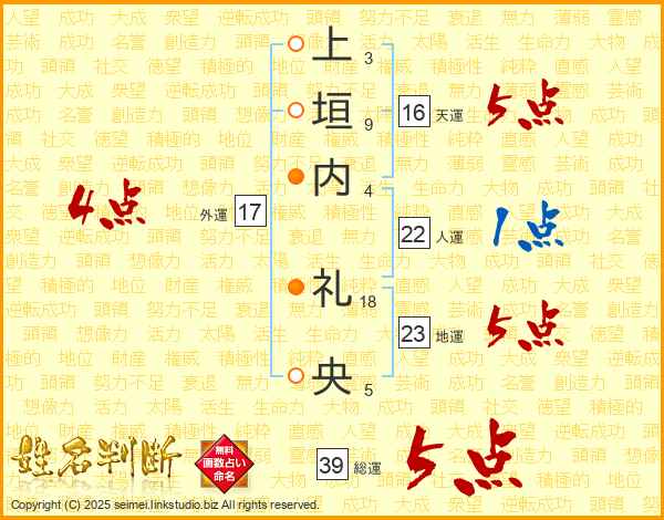 上(3画)垣(9画)内(4画) 礼(18画)央(5画)