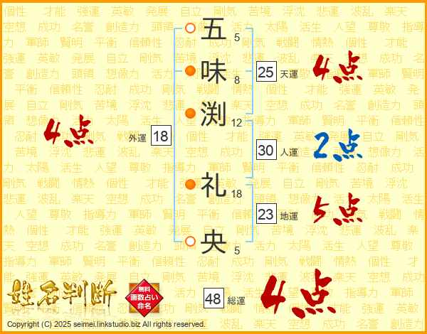 五(5画)味(8画)渕(12画) 礼(18画)央(5画)