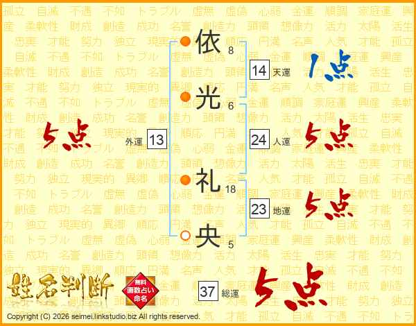 依光礼央さんの総運は37画の5点!