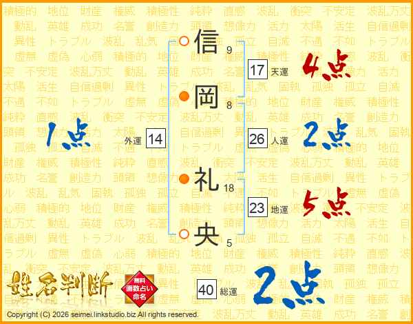 信(9画)岡(8画) 礼(18画)央(5画)