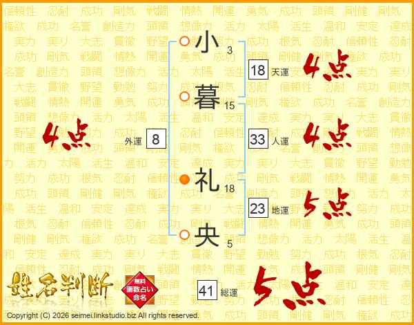 小暮礼央さんの総運は41画の5点!