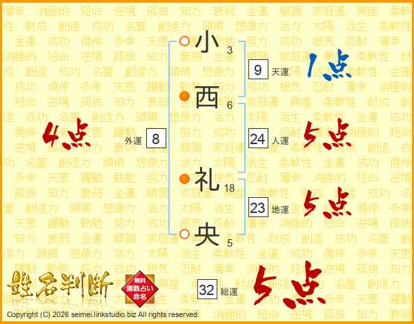 小西礼央さんの総運は32画の5点!