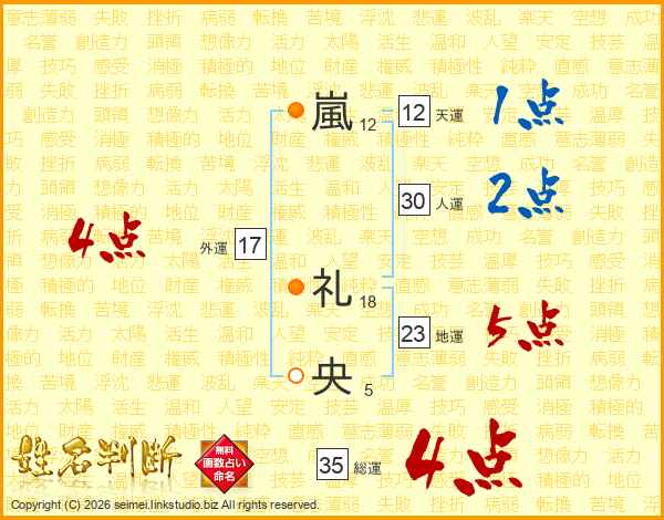 嵐礼央さんの総運は35画の4点!