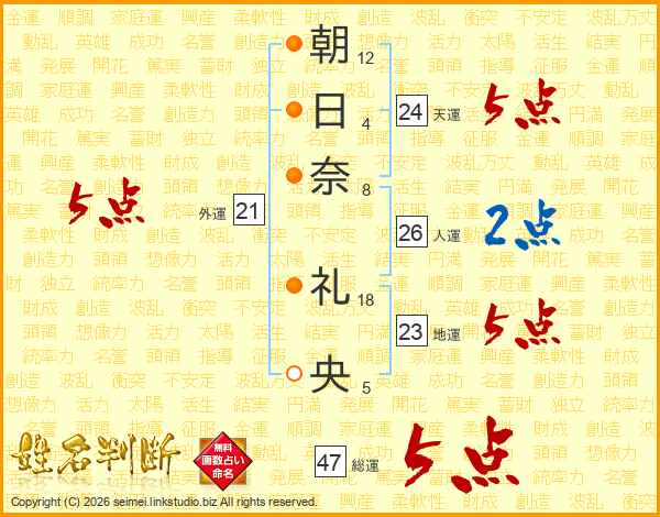 朝(12画)日(4画)奈(8画) 礼(18画)央(5画)