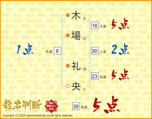 あなたの人生を表す1番重要な運勢です。生涯を通じて影響する総合運となり、主に50歳以降の晩年期に影響を及ぼします。苗字と名前の合計画数。
