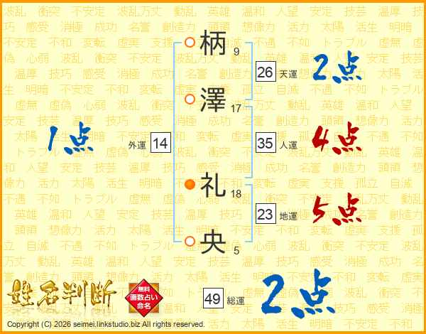 柄(9画)澤(17画) 礼(18画)央(5画)