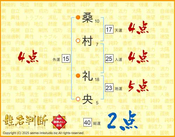 生活面を象徴する運勢です。外部から受ける影響力を表し、結婚運、家庭運や職場、環境への順応性を表します。総運から人運を引いた画数。姓や名が1文字の場合を除く。