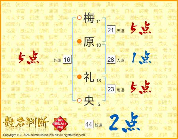 あなたの人生を表す1番重要な運勢です。生涯を通じて影響する総合運となり、主に50歳以降の晩年期に影響を及ぼします。苗字と名前の合計画数。