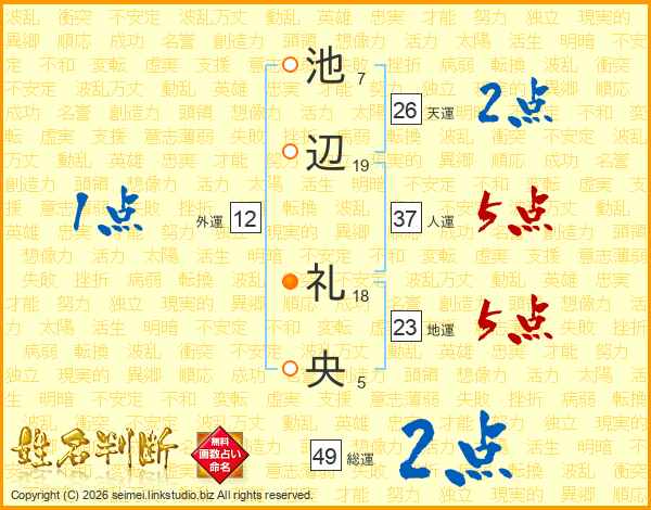 池(7画)辺(19画) 礼(18画)央(5画)