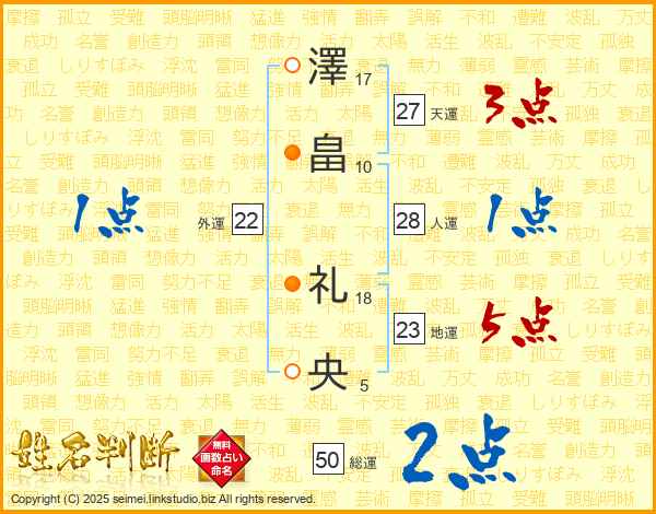 澤(17画)畠(10画) 礼(18画)央(5画)
