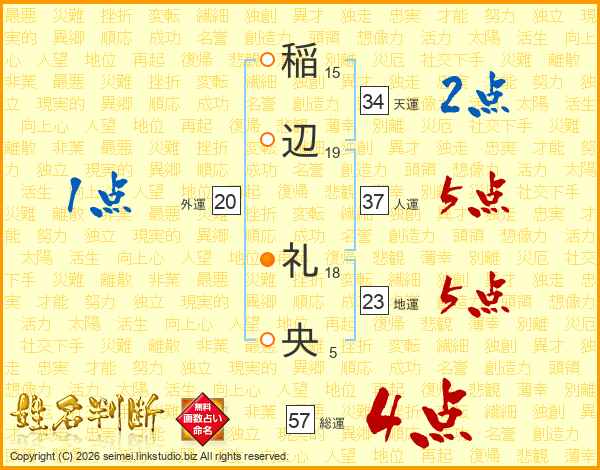 稲(15画)辺(19画) 礼(18画)央(5画)