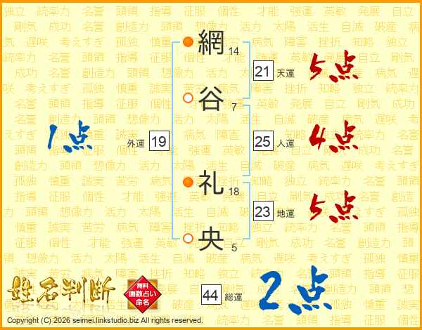 網谷礼央さんの総運は44画の2点!