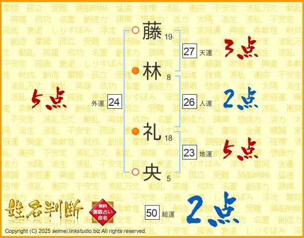 生活面を象徴する運勢です。外部から受ける影響力を表し、結婚運、家庭運や職場、環境への順応性を表します。総運から人運を引いた画数。姓や名が1文字の場合を除く。