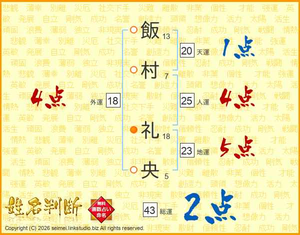 生活面を象徴する運勢です。外部から受ける影響力を表し、結婚運、家庭運や職場、環境への順応性を表します。総運から人運を引いた画数。姓や名が1文字の場合を除く。