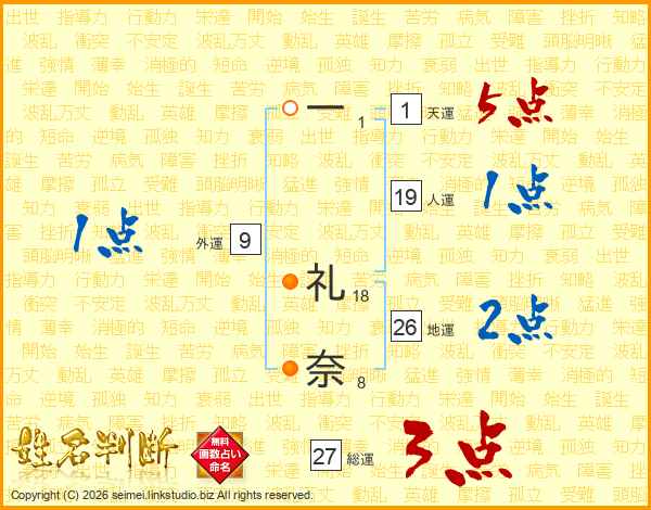 生活面を象徴する運勢です。外部から受ける影響力を表し、結婚運、家庭運や職場、環境への順応性を表します。総運から人運を引いた画数。姓や名が1文字の場合を除く。