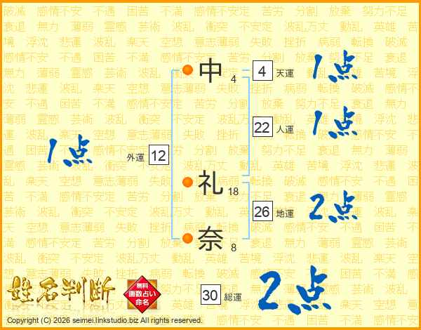 生活面を象徴する運勢です。外部から受ける影響力を表し、結婚運、家庭運や職場、環境への順応性を表します。総運から人運を引いた画数。姓や名が1文字の場合を除く。