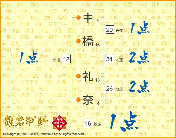 中(4画)橋(16画) 礼(18画)奈(8画)