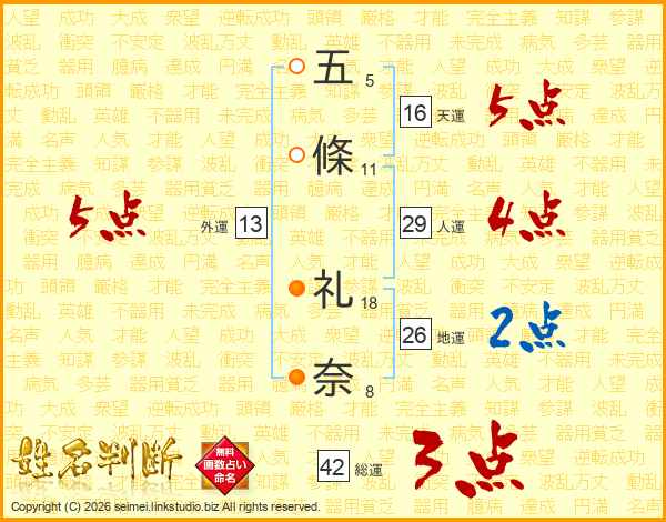 あなたの人生を表す1番重要な運勢です。生涯を通じて影響する総合運となり、主に50歳以降の晩年期に影響を及ぼします。苗字と名前の合計画数。