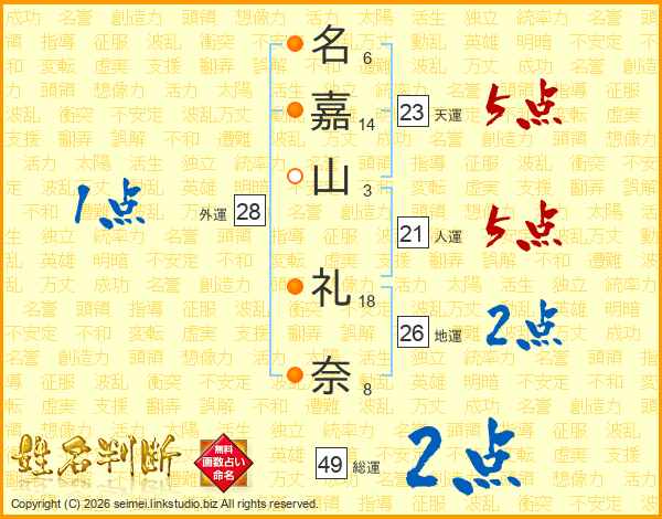 名(6画)嘉(14画)山(3画) 礼(18画)奈(8画)