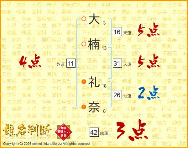 大(3画)楠(13画) 礼(18画)奈(8画)