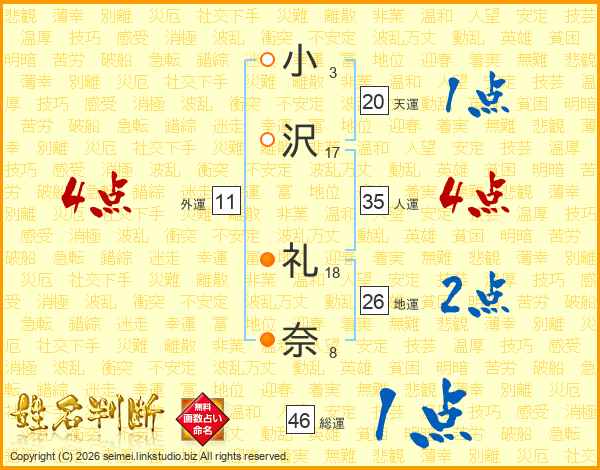 小(3画)沢(17画) 礼(18画)奈(8画)