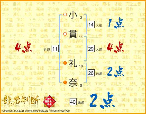 小(3画)貫(11画) 礼(18画)奈(8画)