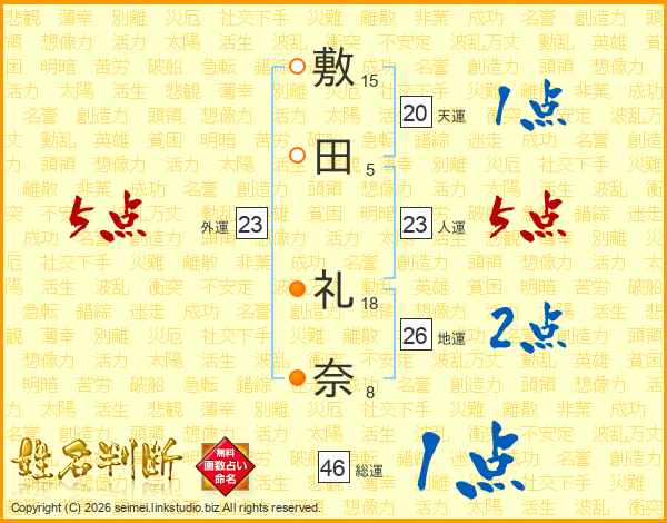 敷(15画)田(5画) 礼(18画)奈(8画)