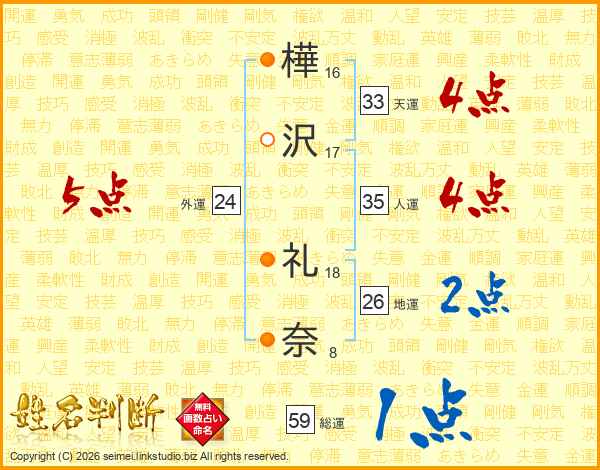 樺沢礼奈さんの総運は59画の1点!