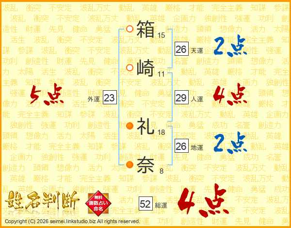 箱(15画)崎(11画) 礼(18画)奈(8画)