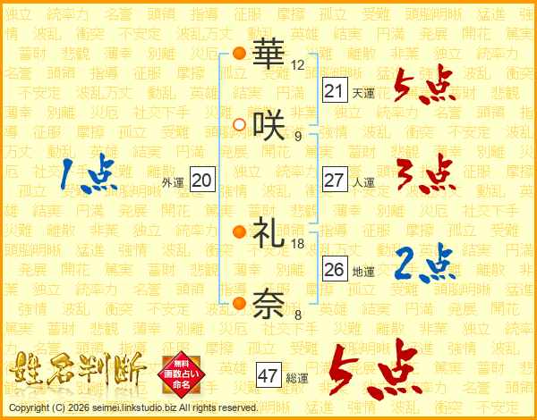 華(12画)咲(9画) 礼(18画)奈(8画)