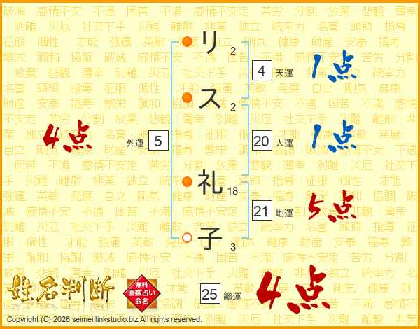 リ(2画)ス(2画) 礼(18画)子(3画)