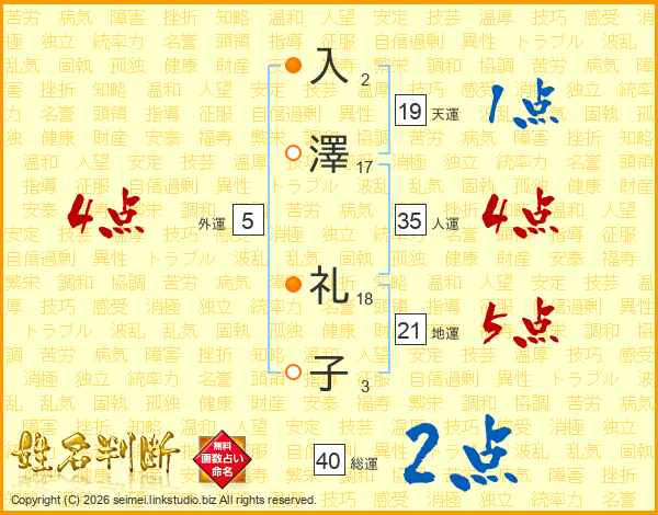 入(2画)澤(17画) 礼(18画)子(3画)