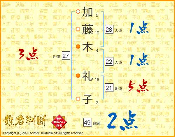 加(5画)藤(19画)木(4画) 礼(18画)子(3画)