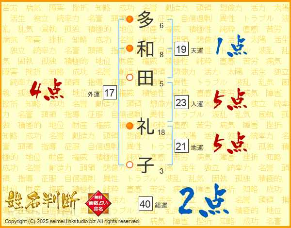 生活面を象徴する運勢です。外部から受ける影響力を表し、結婚運、家庭運や職場、環境への順応性を表します。総運から人運を引いた画数。姓や名が1文字の場合を除く。