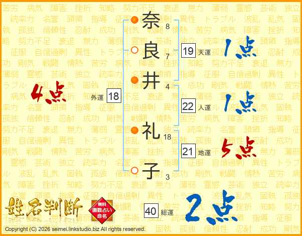 奈(8画)良(7画)井(4画) 礼(18画)子(3画)
