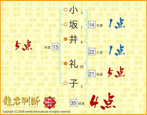 小(3画)坂(7画)井(4画) 礼(18画)子(3画)