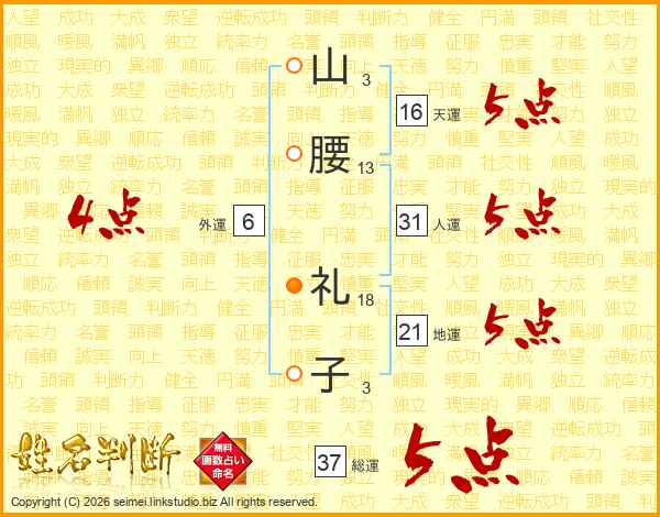 あなたの人生を表す1番重要な運勢です。生涯を通じて影響する総合運となり、主に50歳以降の晩年期に影響を及ぼします。苗字と名前の合計画数。