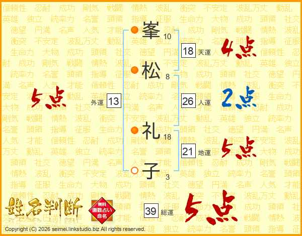 あなたの人生を表す1番重要な運勢です。生涯を通じて影響する総合運となり、主に50歳以降の晩年期に影響を及ぼします。苗字と名前の合計画数。