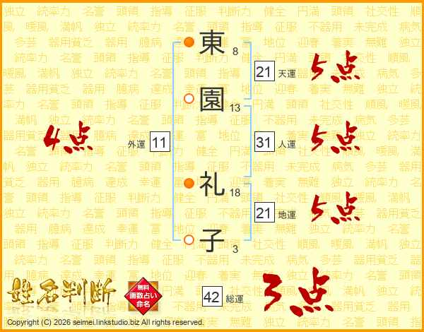 生活面を象徴する運勢です。外部から受ける影響力を表し、結婚運、家庭運や職場、環境への順応性を表します。総運から人運を引いた画数。姓や名が1文字の場合を除く。