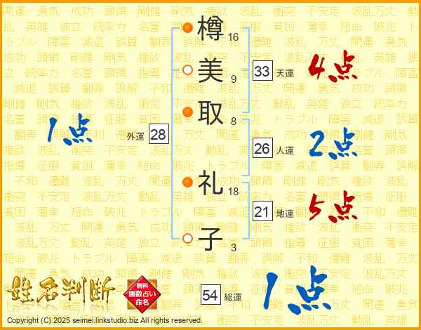 樽(16画)美(9画)取(8画) 礼(18画)子(3画)