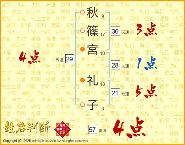 秋(9画)篠(17画)宮(10画) 礼(18画)子(3画)