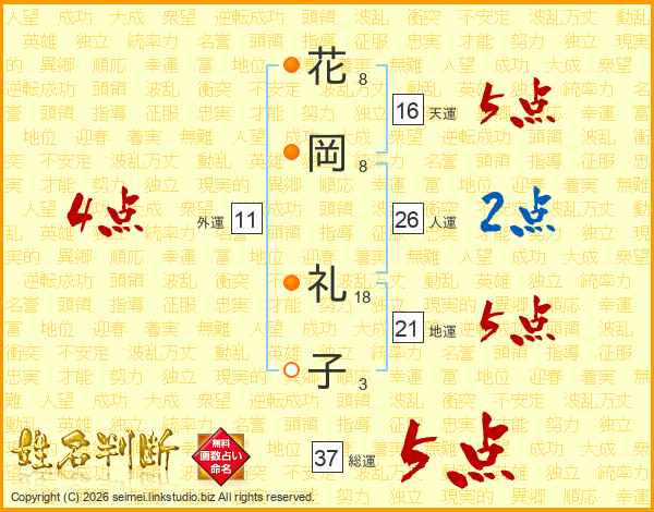 花(8画)岡(8画) 礼(18画)子(3画)